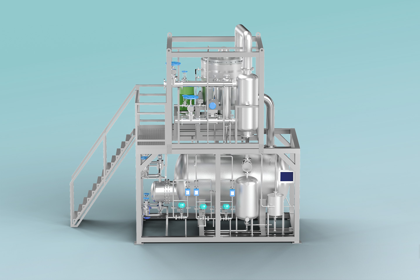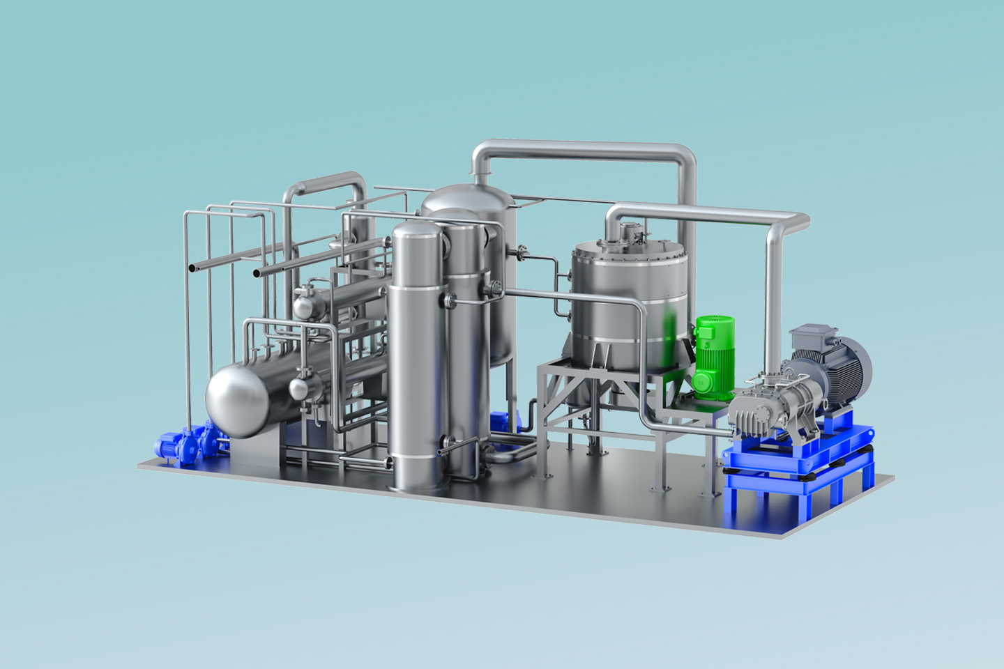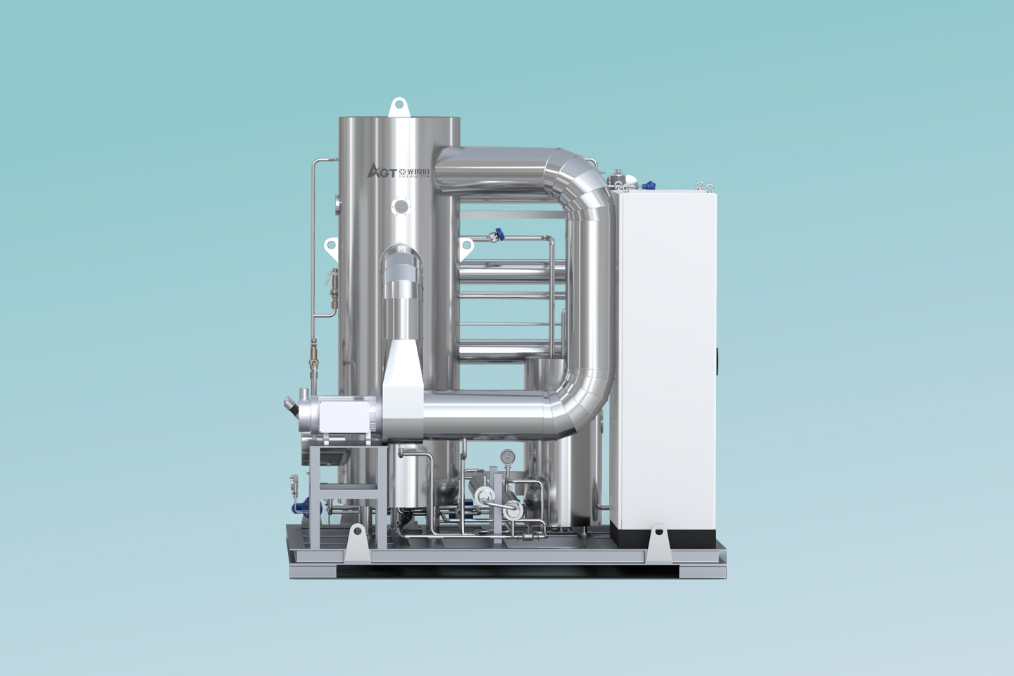 MVR熱泵精餾系統以高效旋轉精餾床為基礎,利用離心力場代替重力場,強化相與相之間的相對速度和相互接觸,通過強化傳質傳熱來提高分離效率縮小設備體積。 通過在系統中引入適用于小流量、大壓比的螺桿式蒸汽壓縮機,即可實現MVR循環熱泵精餾。